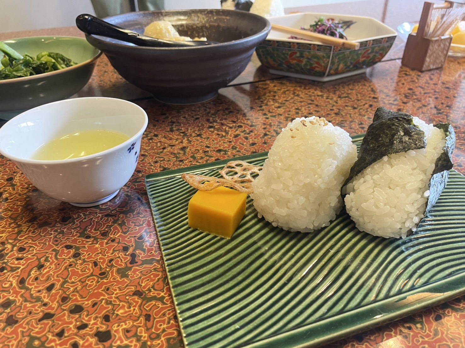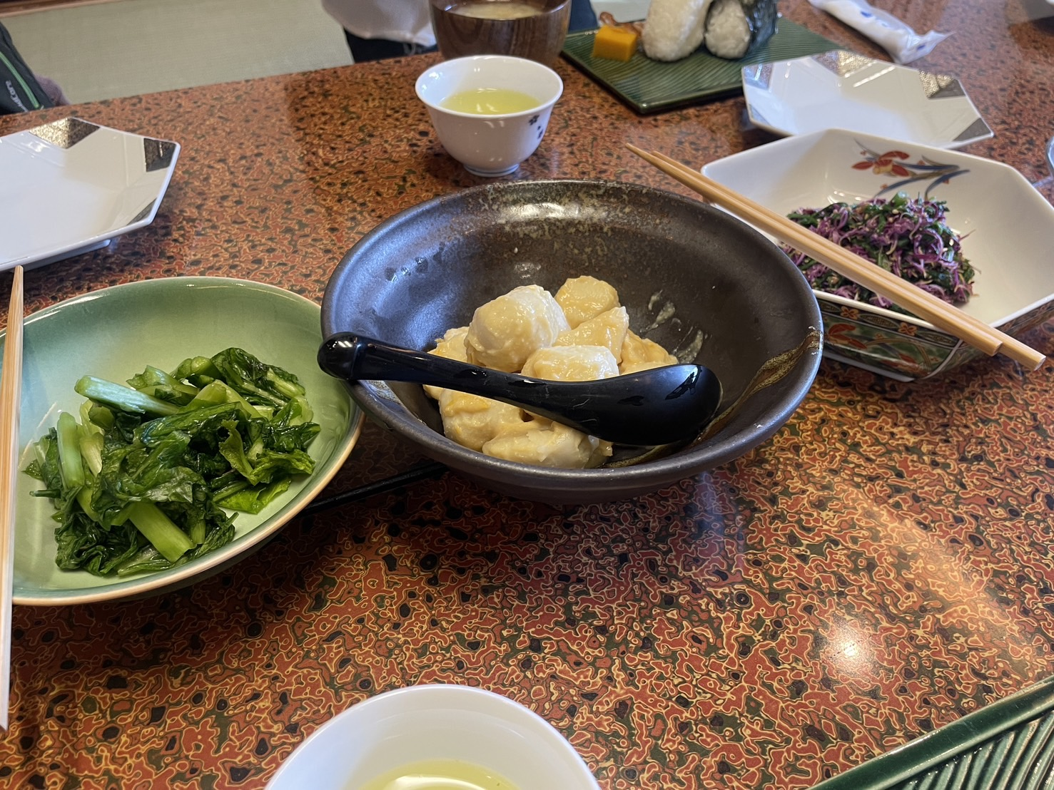 このリトリートツアーでは、雪国の田舎ごっつぉ(ごちそう)をいただくことができます。新潟で育てられたお米を使ったシンプルなおにぎりと旬の食材を使ったおかず数品に、汁物。シンプルなお料理ですが、体に優しく、心がホッとするお料理です。今回は、里芋の柚子味噌煮、かきのもとと春菊の胡麻和え、野沢菜でした。このお料理は参加者の方にとても好評で、料理長にレシピを真剣にお伺いするほどでした…!地元の食材を丁寧に料理した優しいお味をお楽しみください。